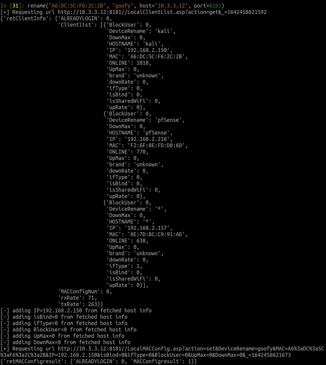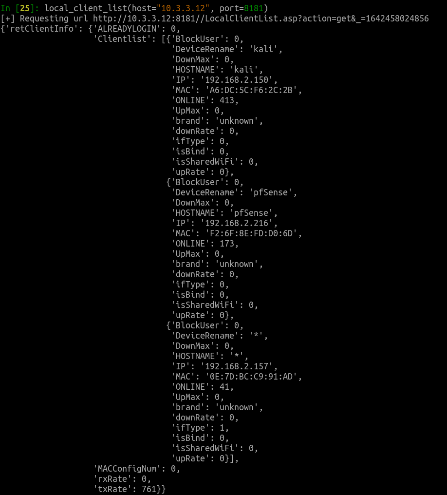 For example, if an attacker is curious what devices might be connected to an exposed router’s local area network, all they need to do is issue a request to http://10.3.3.12:8181/LocalClientList.asp?action=get (assuming 10.3.3.12 is the router’s IP address and 8181 is its remote management port):